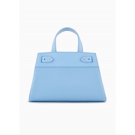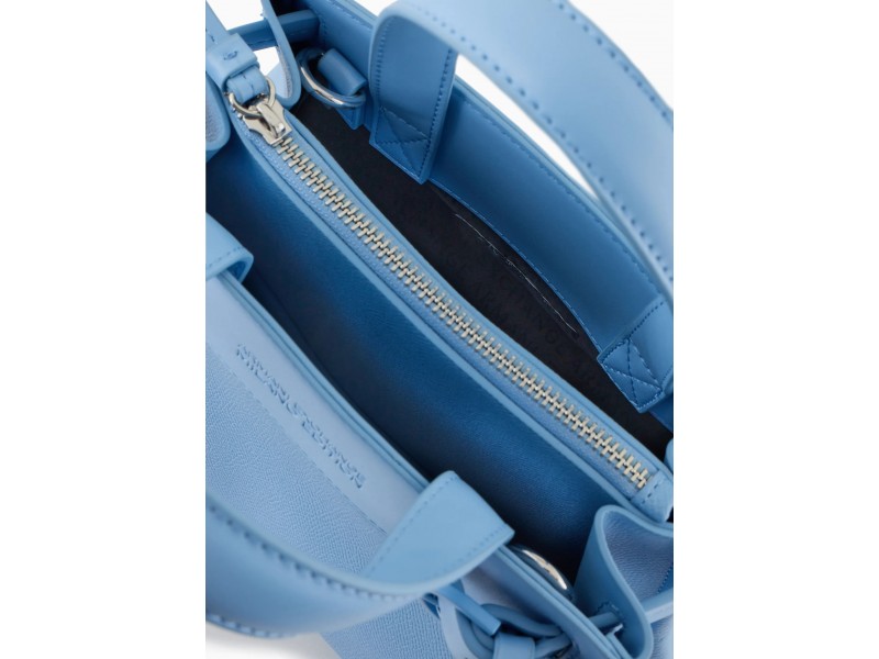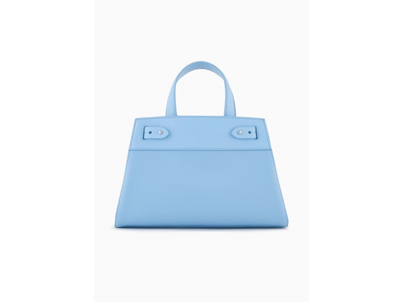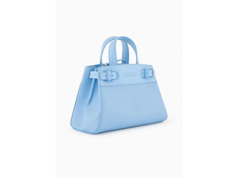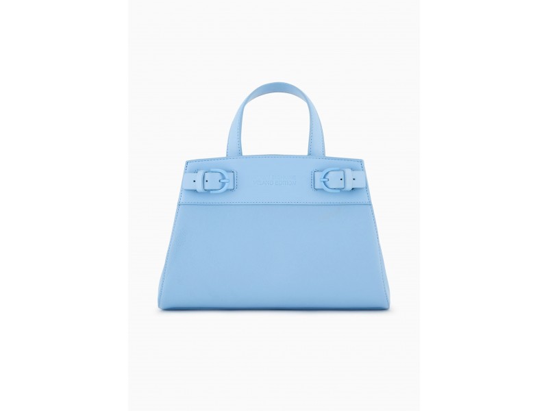 Borsa modello tote realizzata in materiale spalmato dotata di due manici, tracolla removibile, scomparti interni e decorata dalle fibbie laterali.