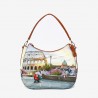 Maniglie in pelle scamosciata fisse e tracolla di servizio in pelle scamosciata removibile e regolabile con gemelli. Chiusura con calamita